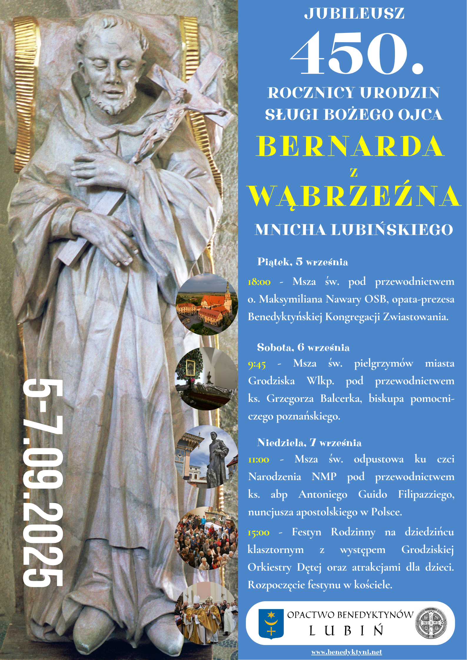Uroczystości jubileuszowe narodzin Sługi Bożego o. Bernarda z Wąbrzeźna OSB odbędą się w dniach od 5 do 7 wrzesień 2025 roku. Oprócz pielgrzymów grodziskich przybywających tradycyjnie w pierwszą sobotę września do grobu Sługi Bożego obchody staną się okazją do zjazdu przełożonych wspólnot odwołujących się do Reguły świętego ojca naszego Benedykta. W niedzielę 7 września uwieńczymy uroczystości odpustem ku czci Narodzenia Najświętszej Maryi Panny, Patronki opactwa lubińskiego, oraz festynem dla rodzin.